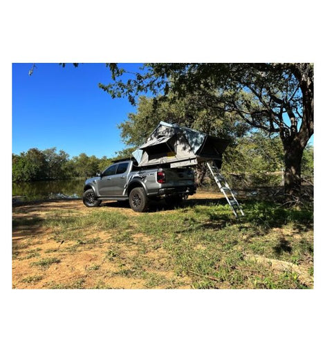 This rooftop tent is set up in minutes. Simply remove the protective cover, extend the ladder, and use it to unfold the tent. Adjust the ladder to the correct height and use the provided rods to tension the flysheet, and you're all set.
